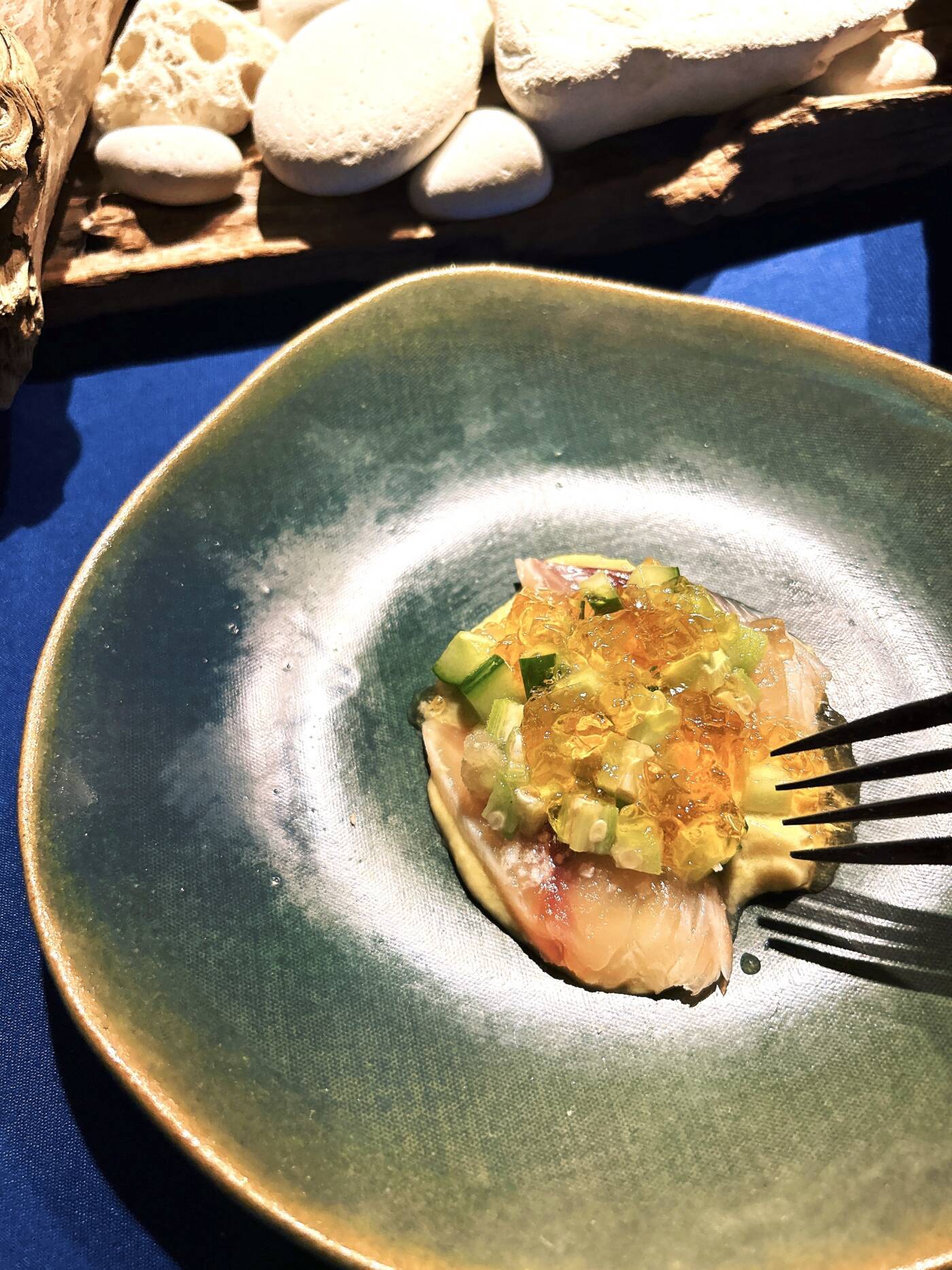 自家栽培白オクラ、胡瓜の食感を添え、香味野菜のジュレで涼やかに。