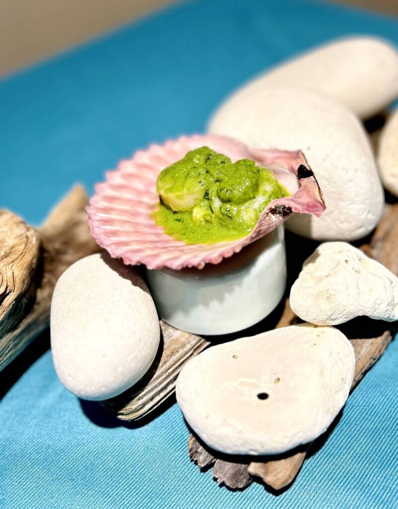 崎津産ヒオウギ貝のロースト、春菊のソース