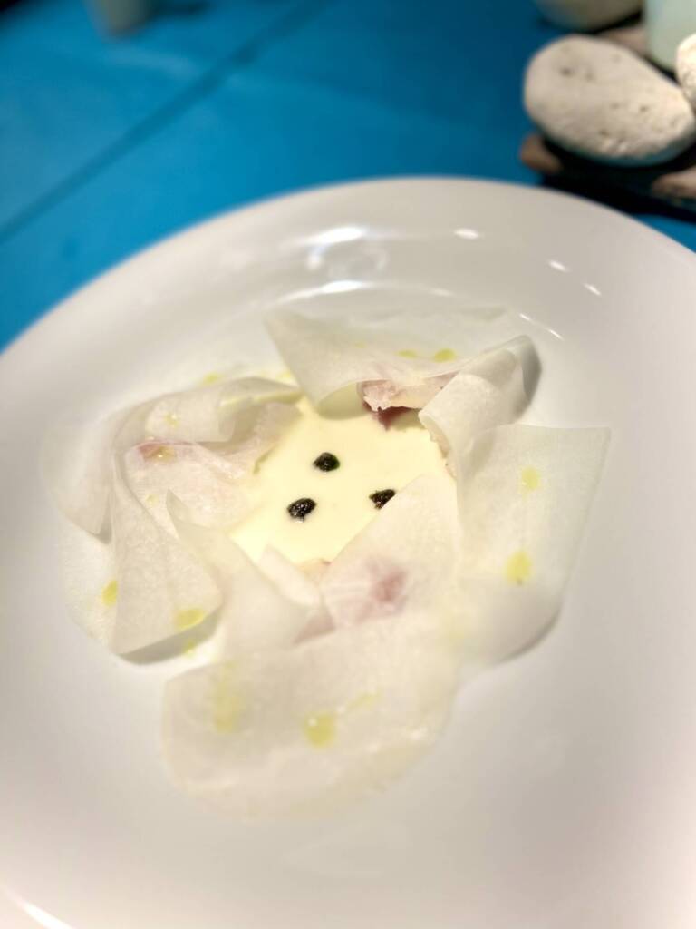 蕪と天草産熟成魚のカルパッチョ、ヴァンブランとビーツの葉のソース、自家製フランスパン。