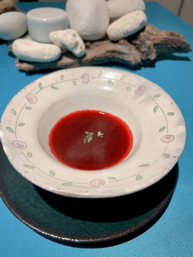 崎津のヒオウギ貝に自家栽培の香り高い春菊のソースを和えて。