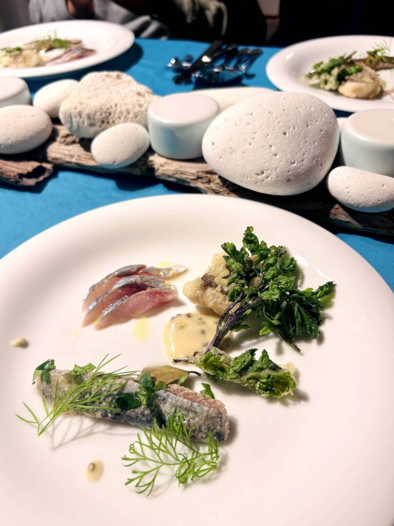 真鯛とハマボウフウのフリット、ヴァンブランとボウフウの茎ソース。